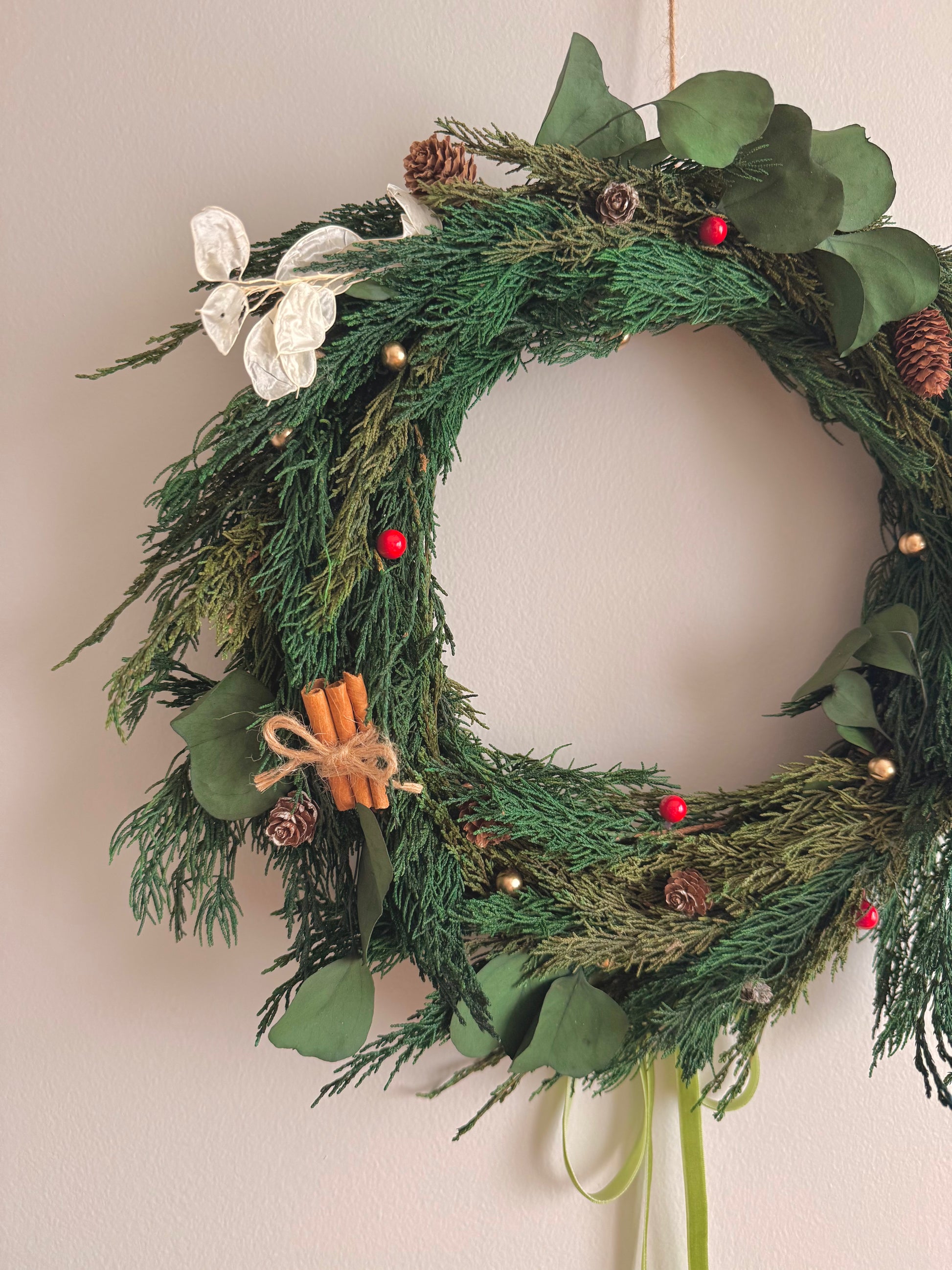 Embrace the season with our Everlasting Preserved Christmas Wreath, a lush, artisanal creation handcrafted from premium preserved evergreens. Designed in a generous 30–35cm diameter, this wreath features layers of cypress, fir, eucalyptus, and other long-lasting foliage that hold their shape and colour beautifully throughout the festive season.